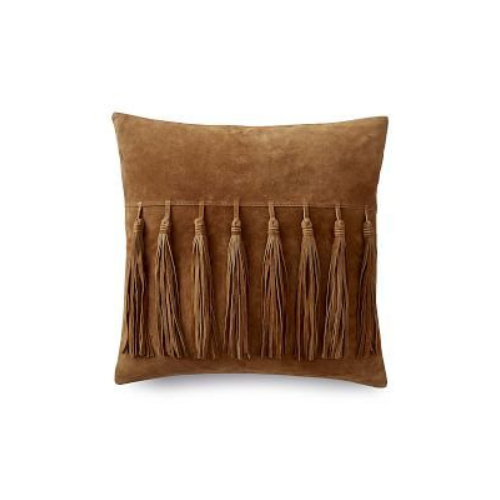 At fns Home Store, this piece is presented as inspiration and can be customized to suit your preferred suede tone, tassel length, and backing finish.