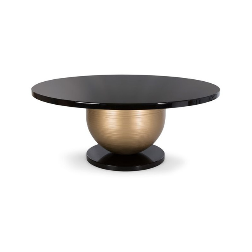 The Round Lacquered Dining Table with Sculptural Orb Pedestal is a visually arresting centerpiece that blends high-gloss finishes with sculptural form. Its round tabletop—suggested in black lacquered wood or metal with a polished sheen—offers a sleek and intimate surface ideal for dining, lounging, or display. The pedestal base features a unique orb-like centerpiece in textured metal or lacquered material with a gold or brass-toned finish, framed by black lacquered top and bottom supports. This mixed-material composition showcases expert craftsmanship and material contrast, emphasizing clean lines and geometric balance. Designed to anchor living rooms, lounge areas, or bedrooms, this piece is both functional and artistic.