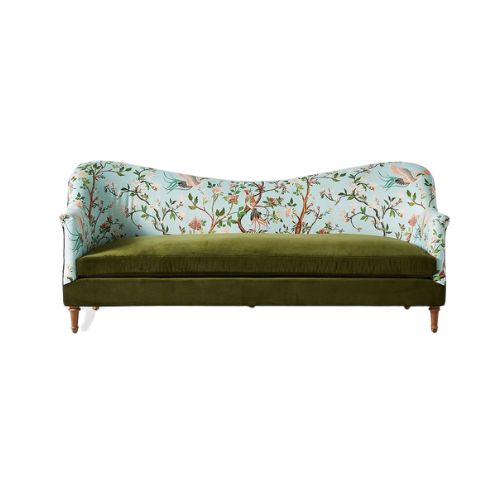 The Terre Daybed Settee is a playful and artistic composition that blends eclectic charm with retro elegance. Its curved backrest and gently tapered legs evoke mid-century inspiration, while the mix of textures and patterns creates a bold visual statement. The back and arms are upholstered in a whimsical bird-and-flower motif in soft blues and multicolor accents, offering a painterly touch. A solid olive or deep green velvet seat cushion anchors the piece with plush comfort and tonal richness. Supported by light wood legs, this settee is designed to stand out in modern, creative, or layered interiors.