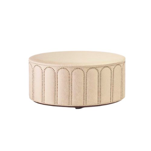 Add a touch of architectural elegance and exceptional comfort to your living space with the Theobald Architectural Occasional Ottoman, a sculptural accent piece that blends classical form with modern versatility. Defined by its round silhouette and distinctive base—reminiscent of arches or fluted columns—this ottoman is upholstered in lightly textured fabric or smooth leather in soft, neutral tones. Decorative nailhead trim outlines the top edge, adding a refined detail that complements its sculptural presence. Perfect as a footrest, coffee table alternative, or extra seat, the Theobald Ottoman integrates effortlessly into curated interiors with its timeless yet artistic appeal.