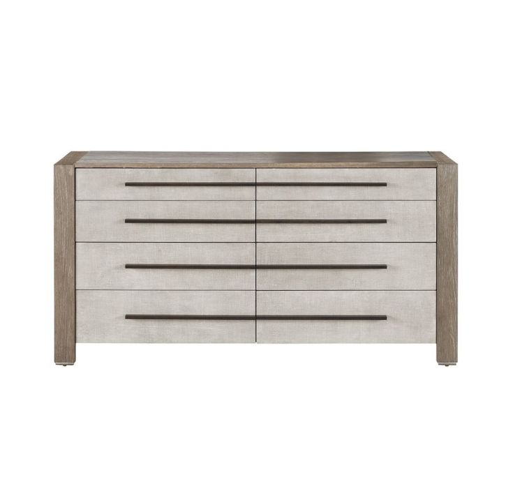 The Vista Drawer Dresser by Universal Furniture offers a contemporary design with clean lines and a subtle rustic touch. Finished in weathered oak or light grey, this piece highlights the natural texture of wood while maintaining a modern silhouette. Six spacious drawers with elongated pulls in dark bronze or brushed nickel tones provide generous storage, while the wide top surface is ideal for displaying decorative accents or everyday essentials. Resting on a plinth or leg base, this dresser blends transitional charm with practical elegance—perfect for bedrooms, guest suites, or curated interiors.