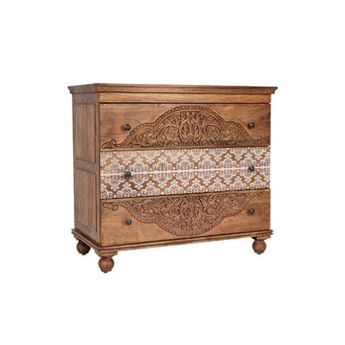 The Warm Wood Chest with Carved Details and Patterned Panel blends traditional craftsmanship with bohemian charm. Its drawer fronts feature intricate carved wood detailing—possibly floral or scroll motifs—while a patterned center panel on the middle drawer adds contrast and character, perhaps in a soft geometric or floral design. A warm wood finish enhances the natural grain and creates an inviting tone. Round metal hardware in antique brass or bronze complements the design, and ball feet offer classic support. With three drawers for storage, this piece is ideal for bedrooms, living rooms, or entryways seeking a textured and eclectic accent.