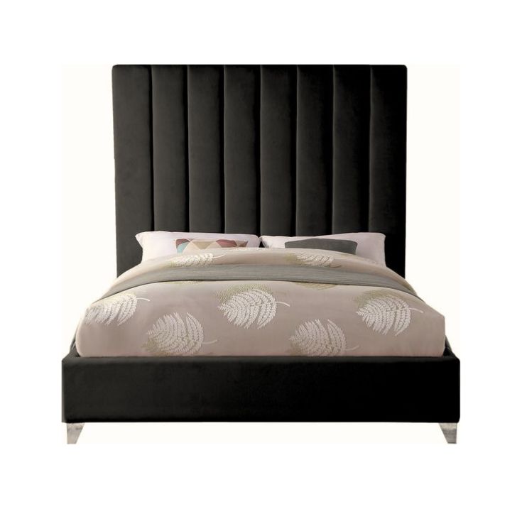 Experience modern elegance and luxurious comfort with the Velvet Bed, a bold statement piece that transforms your bedroom into a sophisticated retreat. Upholstered in plush deep black velvet, the headboard features distinctive vertical channel tufting that adds texture and visual interest. Clean lines and a minimalist silhouette are elevated by acrylic legs with a chrome finish, creating a sleek and airy presence. The fully upholstered platform base offers excellent mattress support without the need for a box spring—perfect for glamorous, contemporary interiors.