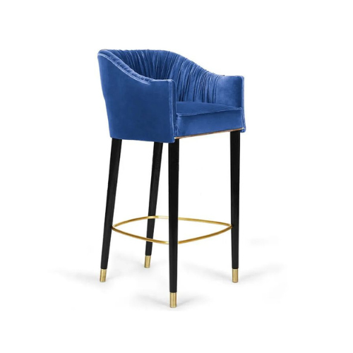 The Royal Blue Velvet Channel-Tufted Barstool is a striking blend of plush comfort and sculptural elegance. Upholstered in rich royal blue velvet, the seat and backrest offer a soft, inviting texture, while channel tufting adds depth and visual rhythm. The open back design introduces modern lightness, complemented by black lacquered wood legs that provide a sturdy foundation. Gold accents—including a circular footrest ring and leg caps—add a refined contrast and touch of glamour. Designed for bar counters or high tables, this piece embodies contemporary sophistication with bold, high-end appeal.