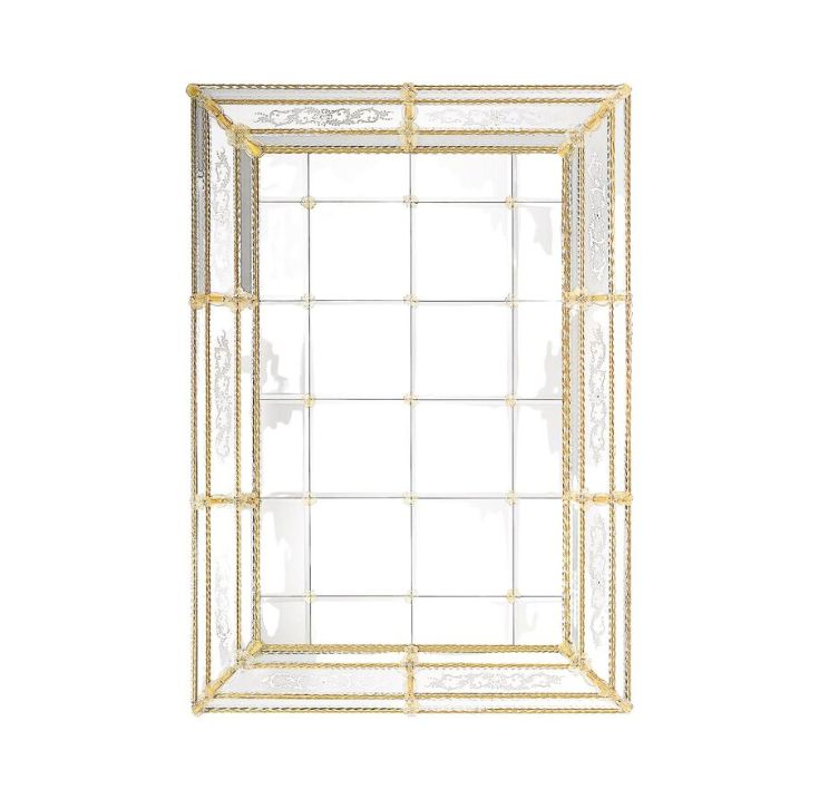 The Venetian Mirror embodies the timeless elegance and intricate artistry of traditional Venetian craftsmanship. Its frame is constructed from individual mirrored glass panels, layered to create a luminous and sculptural effect. Delicate etched floral motifs, twisted rope details, and clear or colored glass accents adorn the surface, showcasing the refined techniques of classic Venetian mirror making. A central rectangular mirror offers clarity and balance, while the ornate silhouette adds glamour and sophistication to any interior.