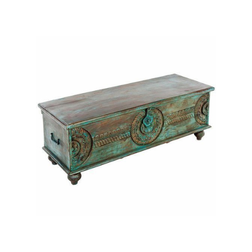 The Distressed Blue Carved Storage Chest is a vintage-inspired accent piece that blends artisanal detail with rustic charm. Its weathered blue finish—suggesting tones of teal or turquoise with worn edges—evokes a sense of age and character, perfect for relaxed or coastal interiors. Intricate circular carvings with rope-like texture adorn the front and sides, adding depth and decorative appeal. A hinged lid opens to reveal a spacious interior, ideal for storing blankets, linens, toys, or household items. Short legs lift the chest slightly off the ground, while side handles enhance both functionality and design.