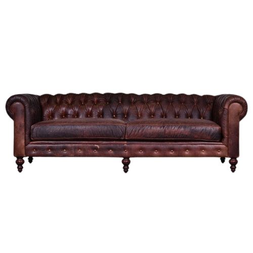 The Vintage Chesterfield 3-Seater Sofa is a distinguished composition that blends timeless British design with aged character and artisanal depth. Upholstered in genuine distressed leather, each piece reveals a unique patina—rich in tonal variation and texture—that deepens with time and use. Its classic Chesterfield silhouette features rolled arms, deep button tufting across the seat, back, and arms, and a low, elegant profile. Stylish turned wood legs lend structural grace and traditional rhythm. Designed to anchor refined interiors, this sofa serves as a statement of enduring style and comfort.