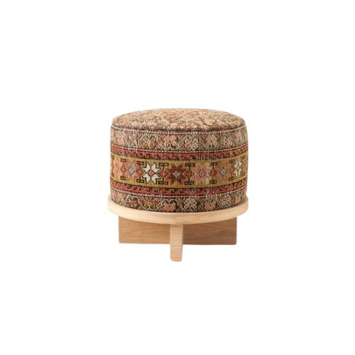 Its top is upholstered in authentic vintage kilim—handwoven wool textiles stitched together in a patchwork of rich, colorful patterns. Resting on a unique, artisan-crafted wooden base, this pouf is available in round or square form and offers compact versatility for seating, footrest, or decorative styling. Each piece carries its own story, making it a soulful addition to curated interiors.
