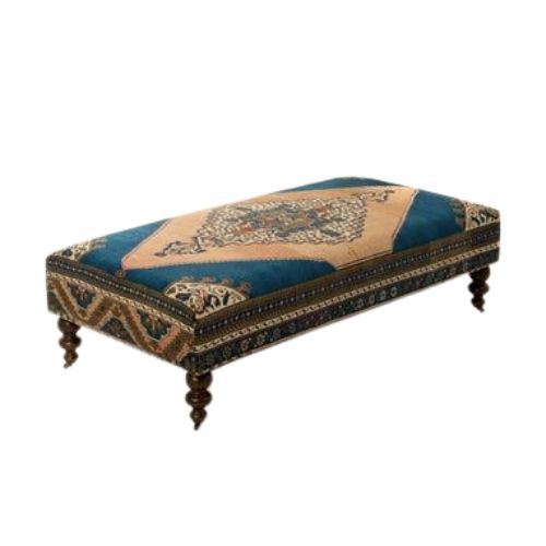 Handmade using traditional techniques, each ottoman features a genuine vintage Persian or kilim rug top, showcasing intricate patterns and rich, soulful colors. A decorative border—stitched or trimmed in complementary fabric—frames the surface, enhancing its artisanal character. With its elongated rectangular silhouette and low-profile base, this ottoman offers relaxed elegance and versatile function. Whether used as a coffee table alternative, footrest, or accent seat, it brings warmth, history, and individuality to curated interiors.