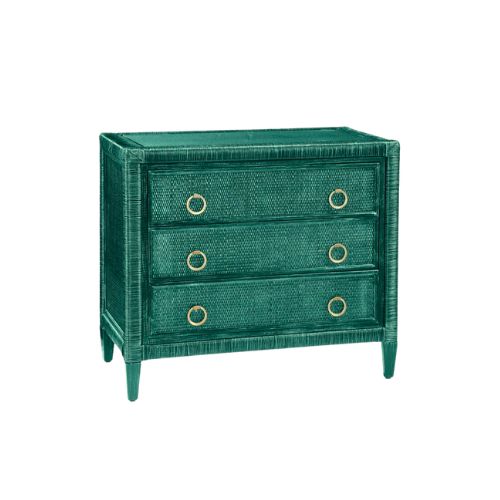 The Warwick Accent Cabinet is a relaxed yet refined storage piece that celebrates natural texture and vibrant color. Crafted from tightly woven wicker—possibly in a geometric or basketweave pattern—it offers a tactile surface full of artisanal charm. The emerald green or teal finish adds a bold splash of color, while round metal hardware in brass or gold introduces a touch of elegance. With three drawers, this cabinet provides ample storage for bedrooms, living rooms, or entryways styled in coastal, tropical, or eclectic themes.