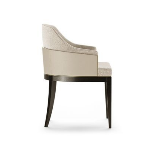 The Modern Classic Dining Chair with Upholstered Armrests is a refined seating piece that blends timeless elegance with contemporary detail. Its fully upholstered seat and back—likely in light-colored fabric or velvet—offer exceptional comfort and softness. Upholstered armrests, possibly in contrasting leather or fabric, add a tailored touch and enhance the chair’s visual depth. A dark stained wood frame provides definition and warmth, while polished metal accent trim on the armrests introduces a subtle note of glamour. Tapered legs complete the silhouette with grace and stability. Designed for dining rooms or kitchens, this chair serves as a sophisticated focal point in both formal and casual settings.